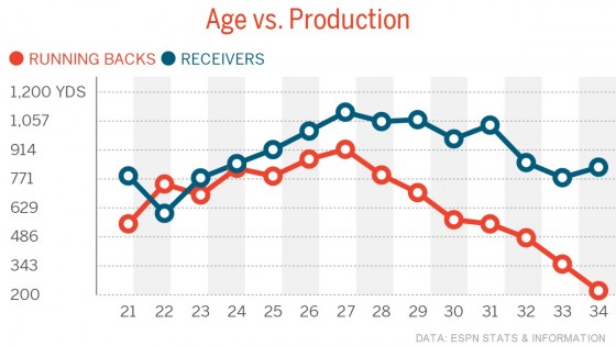A piros vonal a running backeké, akik 2001 óta legalább négy szezont játszottak, legalább évente 75 labdacipeléssel. Ez azt mutatja, hogy a csúcspont 27 éves korban érkezik el, utána pedig erőteljes visszaesés következik. Összehasonlításképpen kékkel jelölték az elkapókat, akik ugyanezen időtartam alatt idényenként legalább 50 elkapással jelentkeztek. Itt látható némi ingadozás, de a harmincas évek elején még mindig elég produktívak a receiverek.