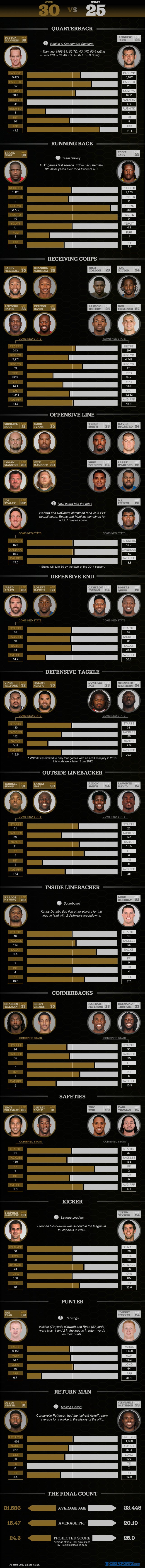A statisztikák és a Pro Football Focus értékelései alapján is szembeállították a játékosokat, mindent összevetve pedig arra a megállapításra jutottak, hogy bár irányító poszton jelenleg sokkal erősebbek a 30-on felüliek, szinte minden másban a 25 évnél fiatalabbak élveznek előnyt.