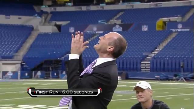 Rich Eisen először 2005-ben futotta le a 40 yardos távot. Akkor még mindenféle felkészülés, bemelegítés, vagy futócipő nélkül állt oda a startvonalhoz. 6,77-es idővel zárt az első évben, azóta pedig hagyománnyá vált, hogy a Combine végén ő is megmutatja magát ezen a távon. 2006-ban óriási javulással 6,18-at hozott, de ennél jobbat az elkövetkezendő öt évben nem tudott teljesíteni. 2012-ben aztán 6,03-at repesztett és feltett szándéka volt, hogy hat másodperc alá egy évvel később már befér. Tavaly azonban ismét megismételte a 6,03-at, így idénre maradt az álomhatár áttörése. Nézzük sikerült-e: