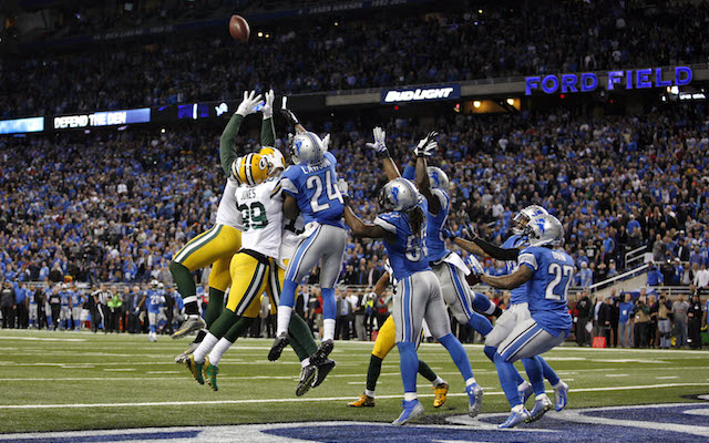 Sam Martin lába viszont csak 35 yardra hordott, így a Packers 23 másodperccel a vége előtt a saját 21 yardosáról jöhetett. Rodgers két pontatlan passza után már csak 6 másodperc volt az órán, amikor a Green Bay trükközni kezdett: hátrafelé passzolgatva próbáltak volna TD-t szerezni. Csakhogy a labda végül Aaron Rodgers-ig került hátra, akit Devin Taylor le is tepert. Az óra lepörgött, úgy tűnt, a meccs véget ért. Ekkor azonban egy sárga zászló repült a gyepre...