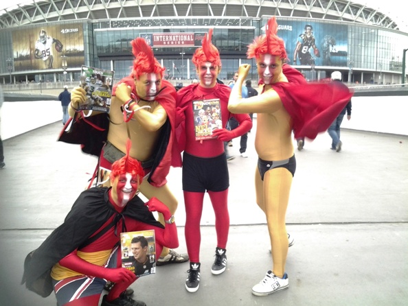 A stadion előtt nem mindennapi figurákkal találkozhattunk: összebarátkoztunk négy angol, aranyásónak öltözött (a 49ers kabalafigurája – a szerk.) San Francisco-rajongóval, akiknek a vezetőjük már 25 éve rajong az amerikai fociért, és aki a fiának is továbbadta a szenvedélyét. (Voltak olyan kedvesek, és pózoltak egyet a TD Magazinnal a kezükben.) Később belebotlottunk egy fiatal amerikai házaspárba is, akik Londonban töltötték a nászútjukat, és esküvői szerelésben nézték végig a mérkőzést, valamint megismertünk öt skót srácot is, akik tojáslabdát dobálva melegítettek a meccsre és egyaránt rajonganak a Glasgow Rangers labdarúgó-csapatáért és az amerikai futballért.