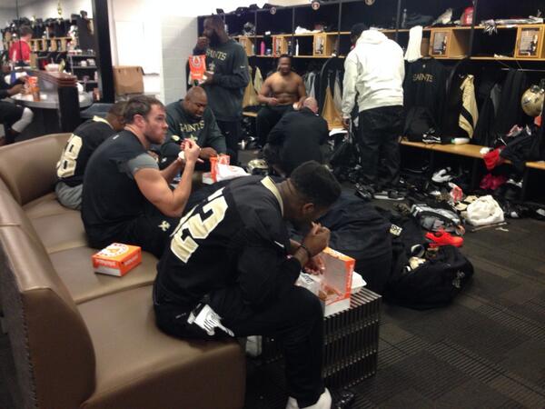 És a Saints játékosok csirkézés közben. A Popeyes csirkés pedig a Saints győzelme láttán már meg is csinálta magának a reklámot, méghozzá azzal a szöveggel, hogy „Aggódsz az idegenbeli siker miatt? Csak vigyél magaddal egy kis hazait.” (Mivel angolul jobban hangzik: „Worried about winning on the road? Just bring along a piece of home.”)