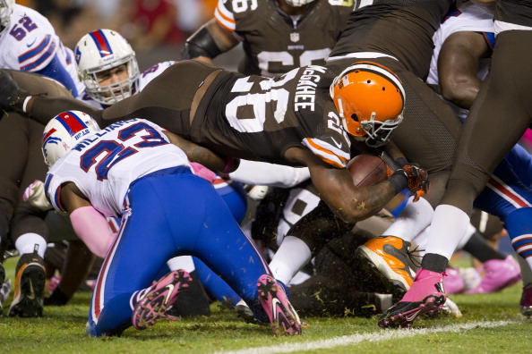 A Cleveland csütörtökön egy Jim Brown nap keretében, a mérkőzés előtt köszöntötte korábbi legendás futóját, az ünnepi hangulat azonban nem tartott sokáig. A Brown puntja után ugyanis a Bills rögtön az első támadásából touchdownt szerzett: Jim Leonhard kiváló visszahordással alapozta meg Fred Jackson 1 yardos pontszerzését. A következő Browns drive aztán még inkább elkeserítette a szurkolókat: Brian Hoyer, az eddig remeklő csereirányító térde csúnyán kifordult, amikor egy szerencsétlen előrecsúszásnál Kiko Alonso, a Bills újonc linebackere leütközte. Alonso nem tehetett az esetről, Hoyer már egyébként is ügyetlenül próbált lemenni a menekülésből, így zászló sem repült az előre felé csúszó QB támadásáért. Bár hivatalos orvosi jelentés még nincs, Hoyer minden bizonnyal elszakította a térdszalagját az esetnél, ami azt jelentheti, hogy idén már nem fog pályára lépni. A Browns-ba így visszatérhetett a korábbi kezdő Brandon Weeden, ami aligha nyugtatta meg a hazaiakat, hiszen irányításával idén csak két veresége van a csapatnak. Ennek megfelelően is alakultak a dolgok a negyed hátralévő részében, hiszen a Bills egy mezőnygóllal növelni tudta előnyét. 10-0 a vendégeknek.