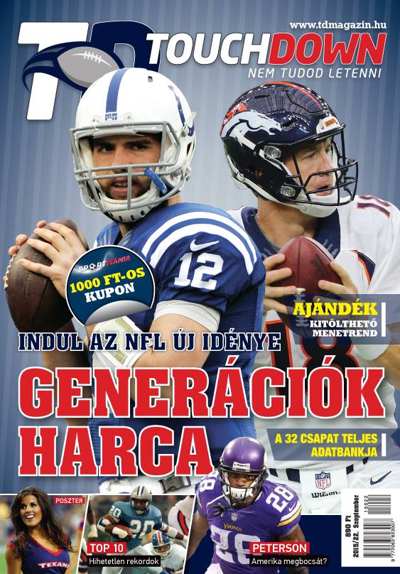 Az előfizetők már tegnap kézhezkaphatták, szeptember 11-től pedig az újságosoknál is kapható a 2015-ös idény első TD Magazinja! Szezonnyitó számunk részletes adatbankja a tökéletes forrás, ha szeretnéd megtudni, mik voltak a nyár legfontosabb történései, és melyik csapattól mire lehet számítani a következő 5 hónapban. Hosszú cikkben foglalkozunk Adrian Peterson visszatérésével, Chip Kelly holtszezonbeli zseniális húzásaival / ámokfutásával, valamint az NFL és a csalás viszonyával. Természetesen nem maradhatott ki az újságból a poszter melléklet, ajándékként pedig egy kitölthető szezonmenetrendet és egy 1000 Ft Sportmánia vásárlási kupont is 'elrejtettünk' a magazinban. Futás az újságárusokhoz, mert ezt a számot sem tudod majd letenni!