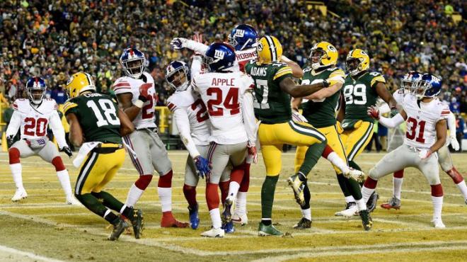 Három meglehetősen sima Wild Card meccs után az egyébként is legjobban várt Giants@Packers találkozó izgalmaiban reménykedhettünk csupán. Az első félidőben tulajdonképpen meg is kaptuk, amit vártunk, szoros, kiélezett küzdelmet vívott egymással a két együttes, sőt a New York-i csapat kezdte jobban a találkozót. Hiába játszott azonban magas hőfokon a védelem, valamint haladt előre szép drive-okkal a támadósor, igazán nagy ütést nem sikerült bevinnie Eli Manningéknek. Elejtett labdák és a Packers jól muzsikáló red zone védelme két mezőnygólon tartotta a vendégeket, majd a Sajtfejűek egy remek kezdőpozíciót, és Aaron Rodgers menekülési képességeit kihasználva, Davante Adams elkapott TD-jével a vezetést is megszerezték.